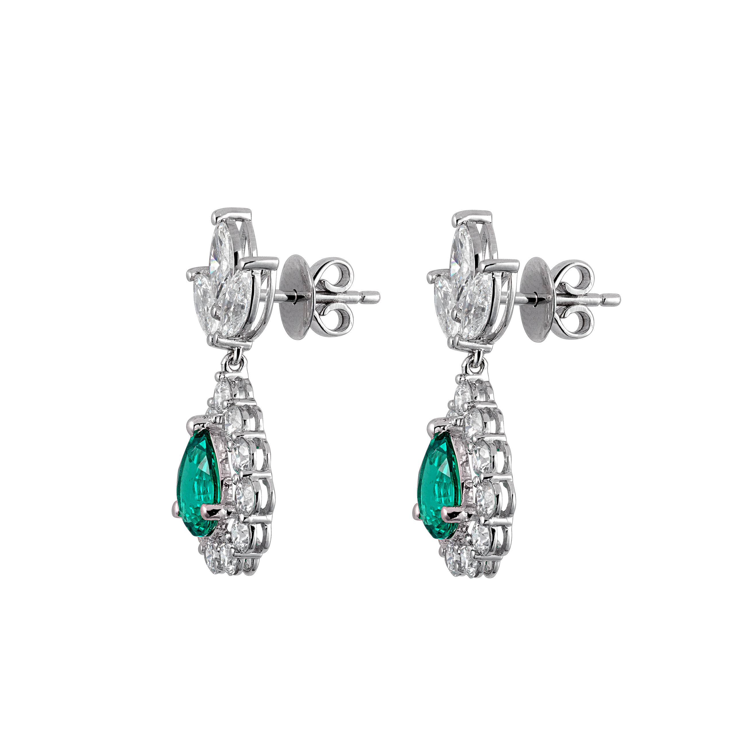 Two pear-shaped green emeralds (approx. 2.00 cts) paired with 6 marquise-cut diamonds and 22 round-cut diamonds, radiating brilliance and timeless elegance.